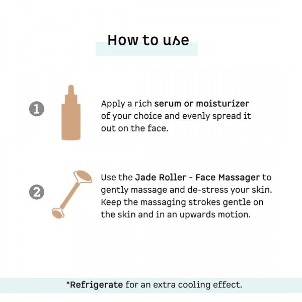 HOW TO USE: Apply a rich serum or moisturizer of your choice and evenly spread it out on the face. And then use the Jade Roller - Face Massager to gently massage and de-stress your skin. Massaging strokes should be gentle on the skin and in an upwards motion. keep your roller in the fridge for the double dose of de-puffing & soothing with cooling sensations.