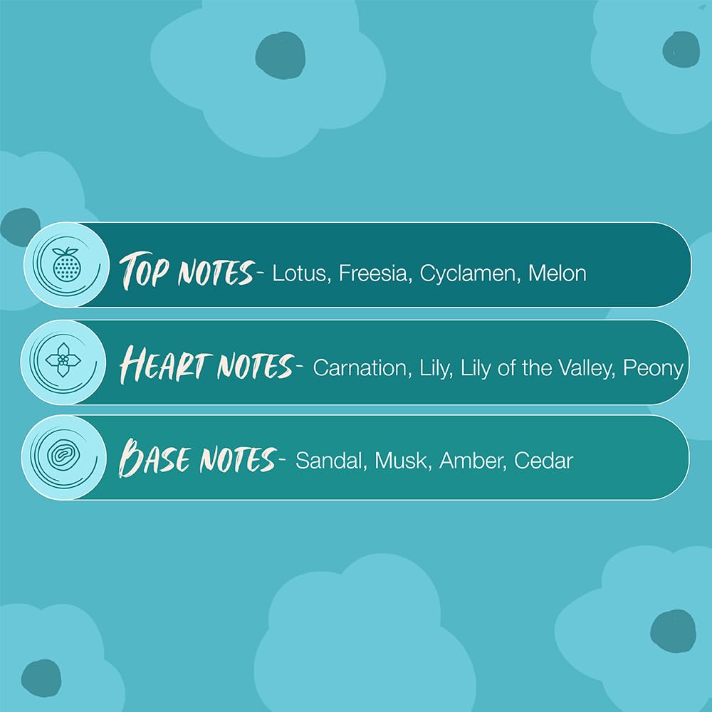 Fragrance Note: Top Note: Lotus, Freesia, Cyclamen, Melon; Heart Note: Carnation, Lily, Lily of the Valley, Peony; Base Note: Sandal, Musk, Amber & Cedar