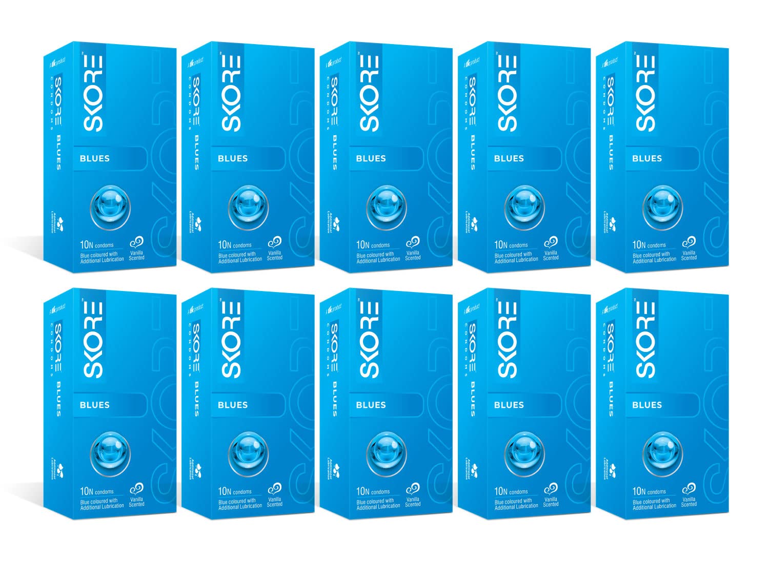 Experience intimate pleasure with the SKORE Blues Condoms, designed to add an exciting twist to your moments of passion. This multi-pack offers ten individual boxes, each containing 10 high-quality condoms, ensuring you're always prepared for spontaneous intimacy. The vibrant blue color of these condoms adds a playful and unique touch, setting them apart from conventional options. SKORE Blues Condoms are not just about color; they are engineered for comfort and heightened sensation. Each condom is pre-lubricated with additional lubrication to provide a smooth and comfortable experience for both partners. The thoughtful addition of a delicate vanilla scent creates an enticing aroma, transforming your intimate encounters into a more sensually appealing experience. The vanilla scent helps to mask any latex odor, allowing you to focus purely on pleasure. These condoms are crafted from premium quality materials, ensuring reliability and safety during use. The precise manufacturing process adheres to international standards, giving you peace of mind with every use. The convenient packaging of 10N condoms per box makes them easy to carry and store, whether you're at home or on the go. The bulk offering in this image ensures you have a consistent supply of your preferred choice.